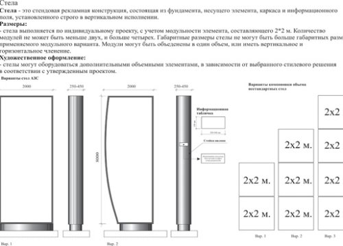 Под проектированием стел для АЗС принято понимать процесс определения архитектуры, компонентов, интерфейсов и других характеристик рекламно-информационной конструкции. Результатом проектирования стелы является технический проект – целостная совокупность моделей, свойств или характеристик, описанных в форме, пригодной для реализации указанной конструкции.